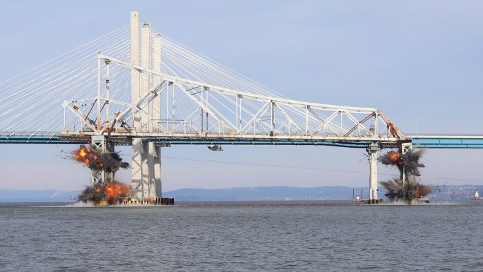 Our DREXSrn (Directional Remote Explosives Severance) systems are engineered and applied to reliably segment steel components into pieces matching the capacity of the contractor’s equipment in consideration of river bottom conditions. State of the art and proprietary underwater blasting techniques ensure fragmentation of piers, dams and other marine structures to removal limits, and maximize efficiency of post-blast debris removal.